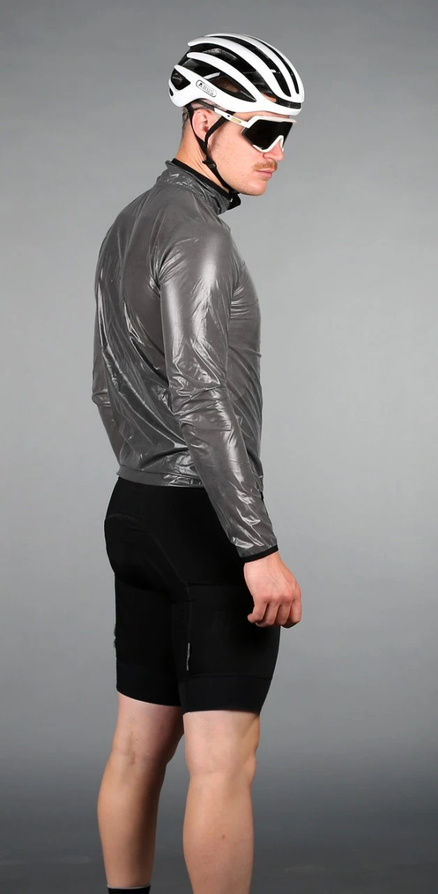 Das elastische und ultraleichte Material besteht aus einer zweilagigen Membran (50% PES/50% PU), ist absolut wasserdicht (Wassersäule: 10.000 mm), winddicht und dennoch hoch atmungsaktiv (>10.000 g/m2/24 h). Durch seine Geschmeidigkeit und Dehnbarkeit bietet die Jacke besten Tragekomfort. Getapte Nähte bieten einen zusätzlichen Wetterschutz. Der enganliegende Race-Schnitt sitzt wie eine zweite Haut und ist ergonomisch perfekt auf die Körperhaltung auf dem Rad angepasst. Das Vorderteil ist verkürzt und dank des stark verlängerten Rückenteils werden Gesäß und unterer Rückenbereich vor Spritzwasser geschützt.