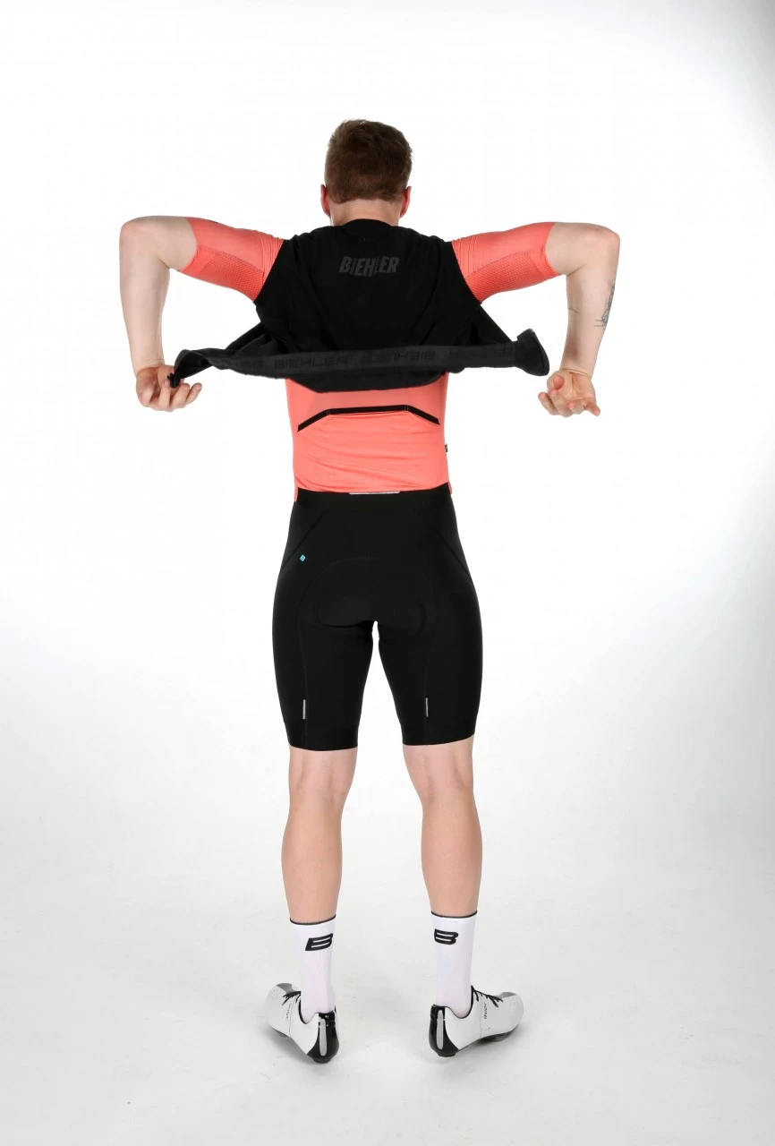 Dank des ausgezeichneten, extrem flachen Multi-Density-Sitzpolsters ist es uns gelungen besten Komfort bei höchster Belastung sicher zu stellen. Das Polster sorgt auf Grund der Skyved Air-Cell Technologie auch an heißen Tagen für eine optimale Belüftung. Die verbesserten Powerband Beinabschlüsse halten perfekt ohne einzuengen. Die antibakteriell ausgestatteten Träger wurden komplett neu konstruiert und verringern den Druck auf der Schulterpartie. Für eine zusätzliche Sicherheit bei Fahrten bis in die Dämmerung sorgt das High-Visibility-Konzept mit reflektierenden Details und einem reflektierendes Biehler Logo.